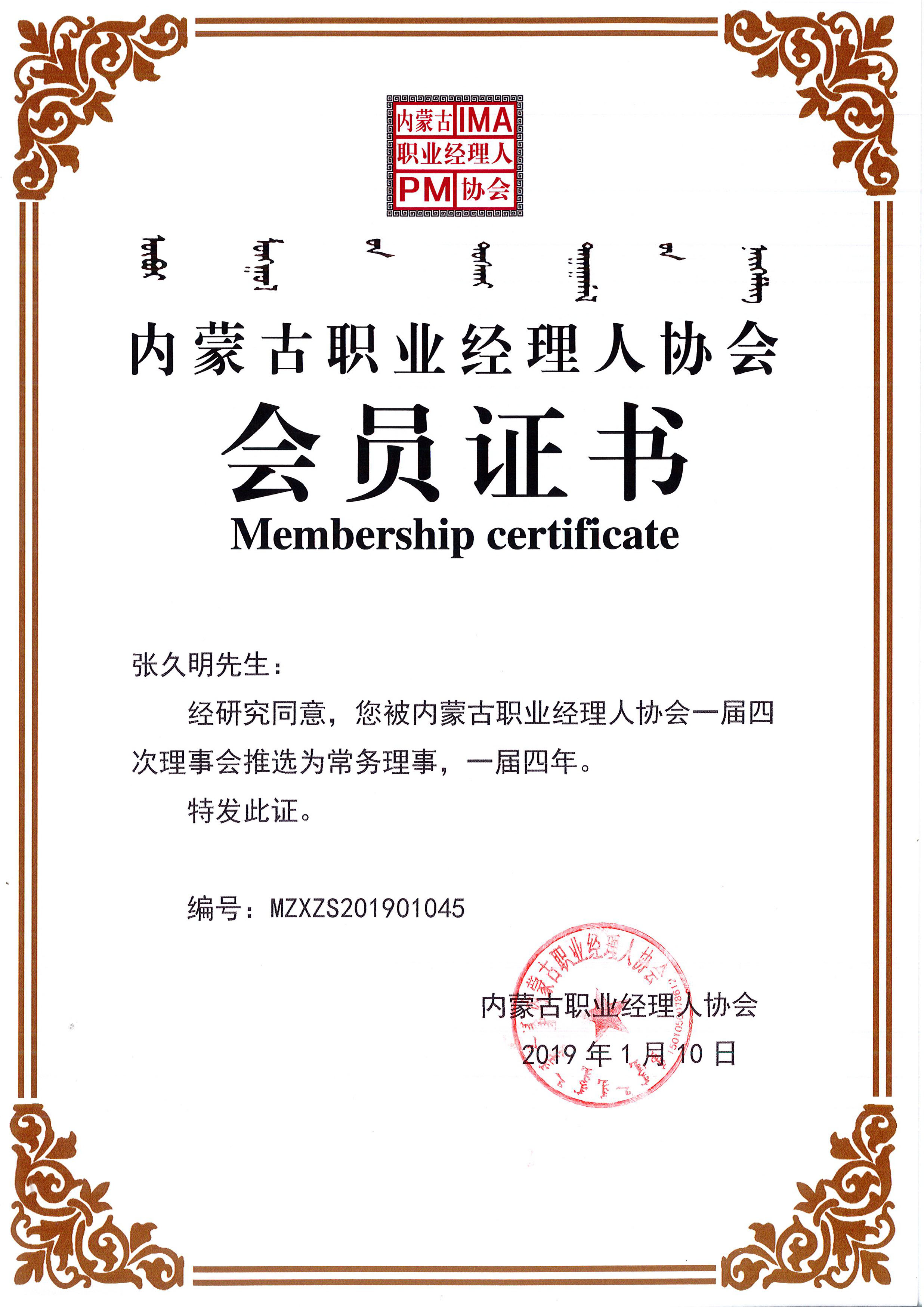 內(nèi)蒙古職業(yè)經(jīng)理人協(xié)會會員證書
